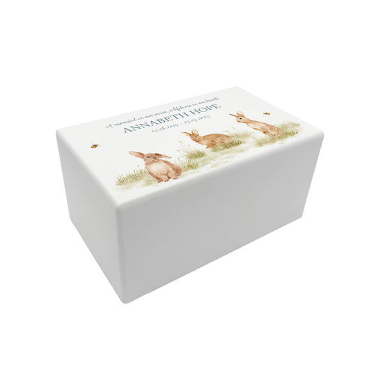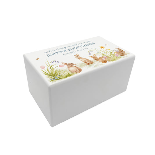 Memorial Baby Bunnies Rectangular White Wooden Urn