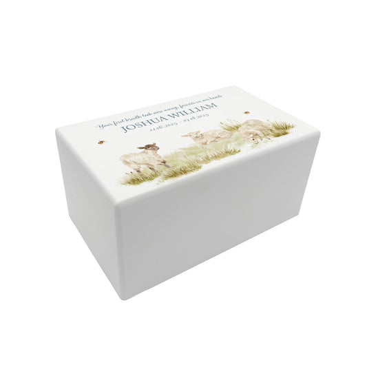 Memorial Baby Lambs Rectangular White Wooden Urn