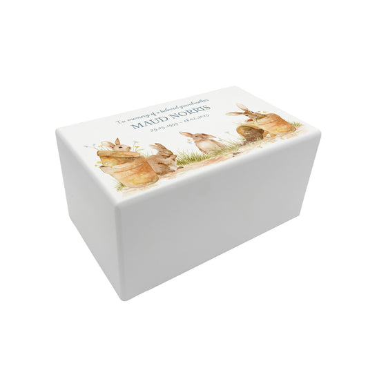 Memorial Blooming Bunnies Rectangular White Wooden Urn