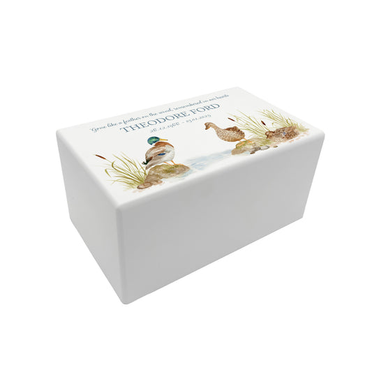 Memorial Ducks Rectangular White Wooden Urn