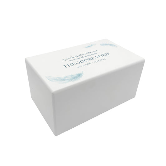 Memorial Feathers Rectangular White Wooden Urn