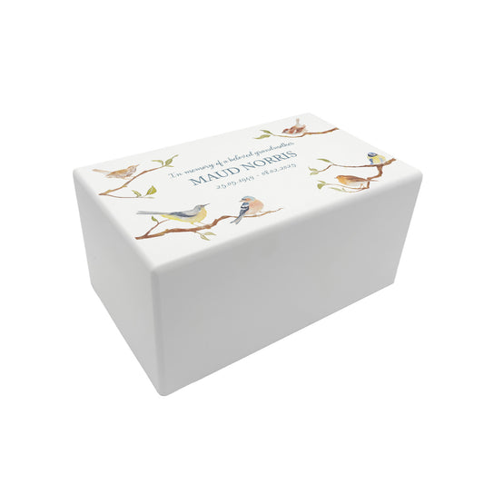 Memorial Robins on Branches Rectangular White Wooden Urn