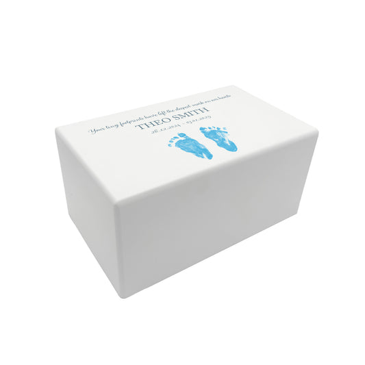 Memorial Hand and Footprint Rectangular White Wooden Urn