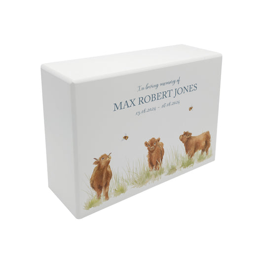 Memorial Baby Highland Cow Keepsake White Wooden Box