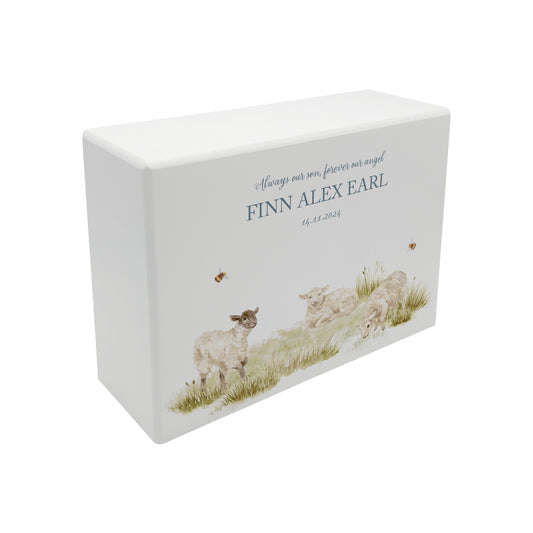 Memorial Baby Lambs Rectangular White Wooden Urn