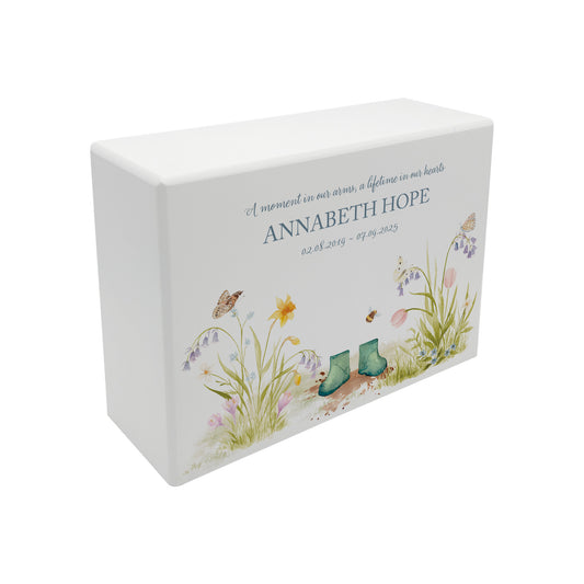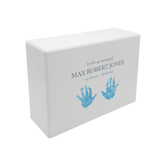 Memorial Hand and Footprint Rectangular White Wooden Urn