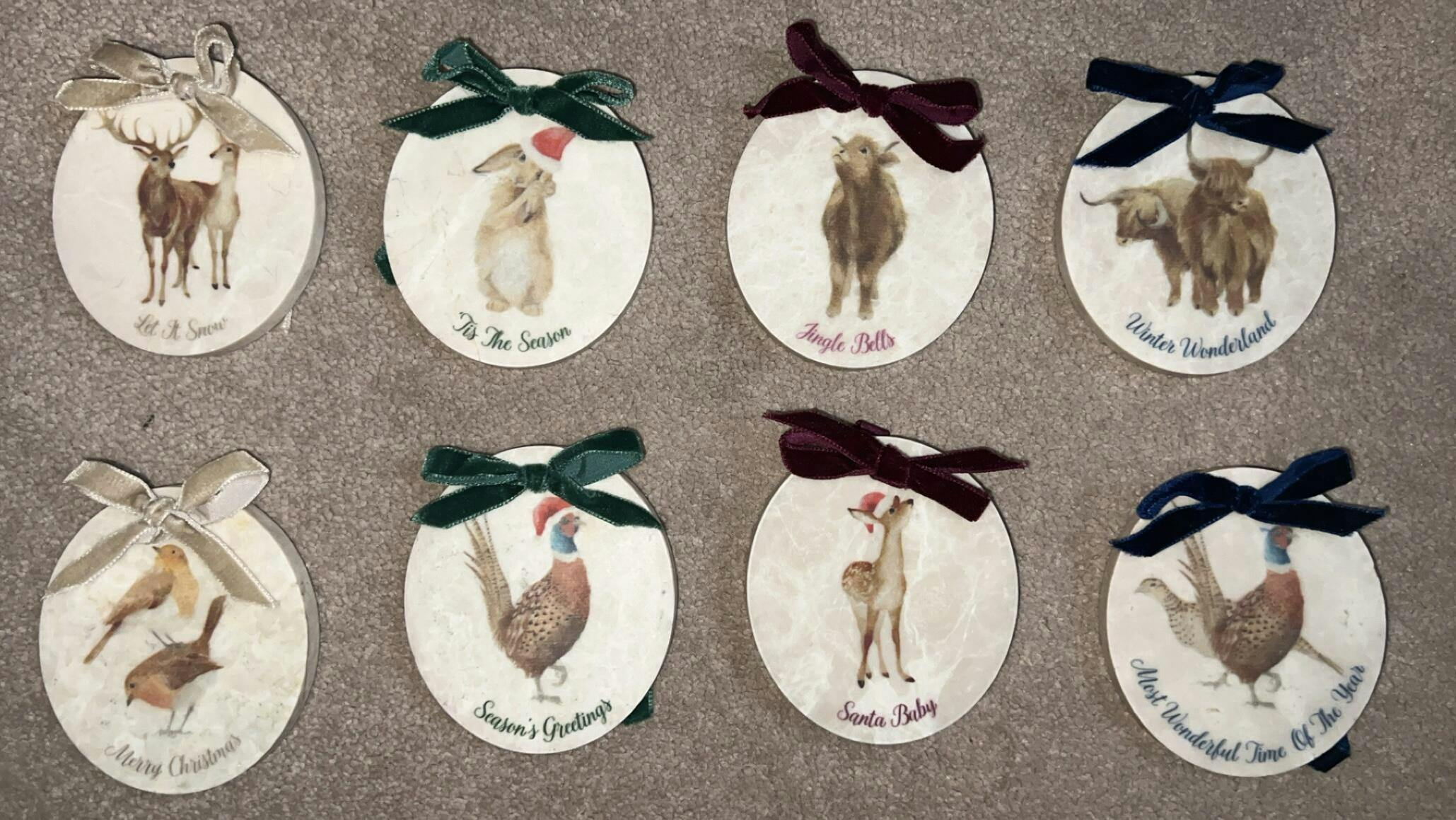 Each ornament in the gift set can be personalised with your choice of name, date, or special message to create a truly unique and personal keepsake. These timeless decorations bring the British countryside to your seasonal décor, and make the perfect bespoke holiday gift for loved ones. Every Christmas decoration is finished with a luxurious velvet ribbon.