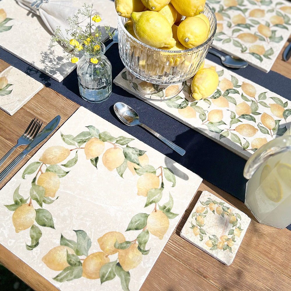 Inspired by summer holidays in the Mediterranean, the zest and warmth of ripe lemons fills The Lemon Grove collection. We've designed this collection with al fresco dining in mind, for those balmy summer days in the garden sipping iced drinks and enjoying the company of family and friends.