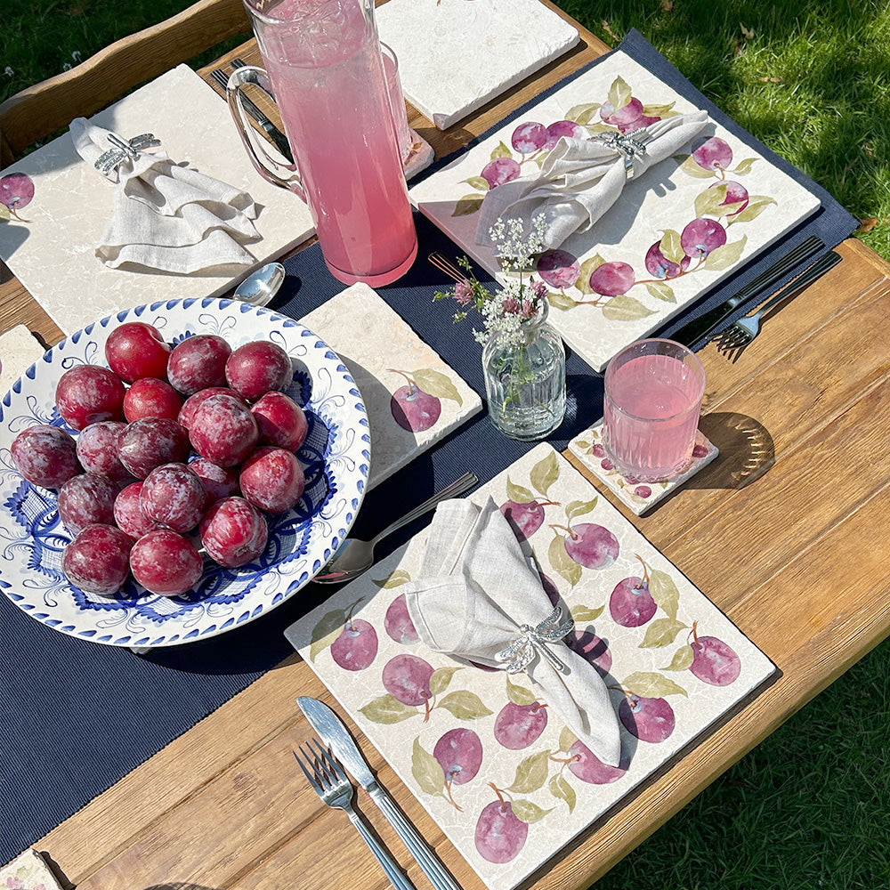 Inspired by an English orchard ripe with fruit and celebrating the bounty of the British countryside, this design captures the deep purple tones and chalky bloom of the humble plum.